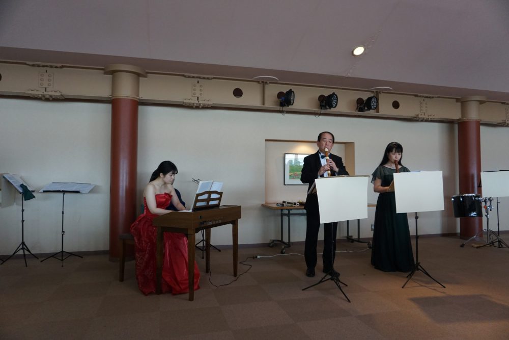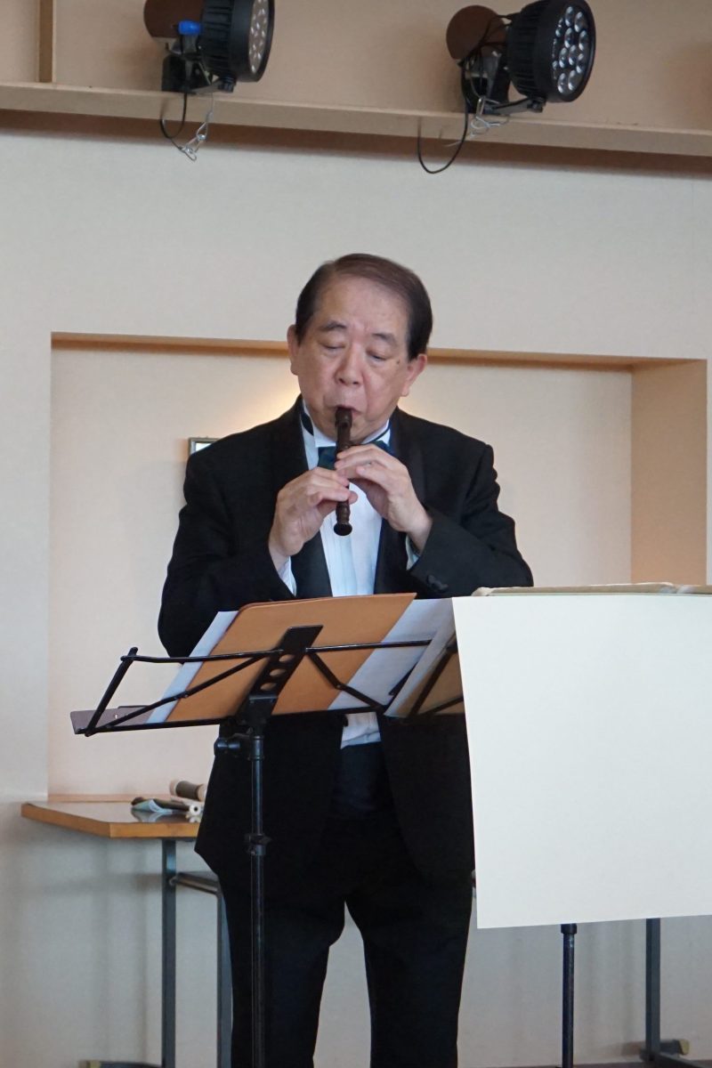 田村先生との2重奏 w.ウィリアムズの「鳥の鳴き声の模倣によるソナタ」でオープニングして、先生の曲の紹介でヘンデル「ソナタ イ短調」「恋のうぐいす」などソロ曲を5曲、他に歌との2重奏、更に7重奏、合奏を演奏致しました。