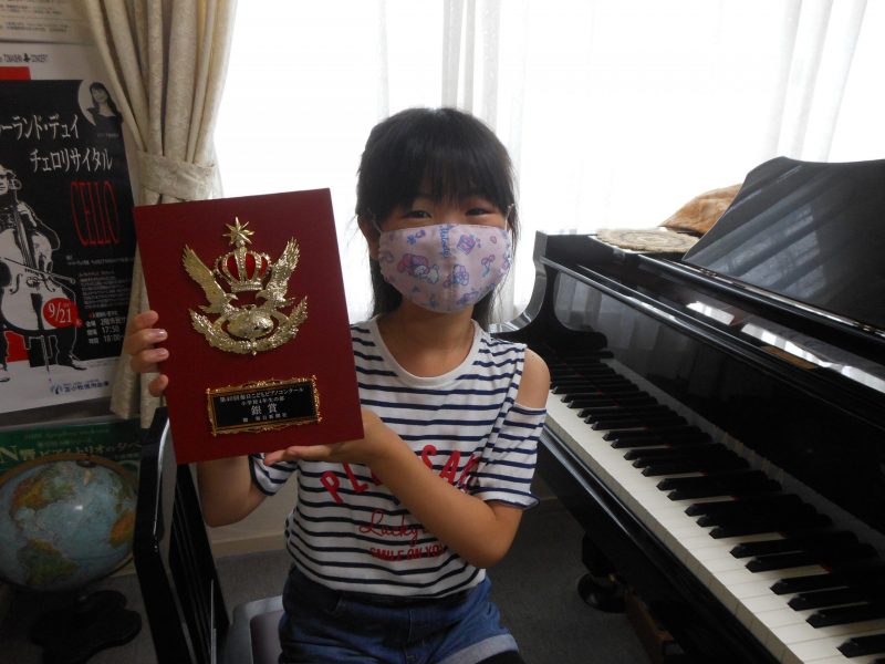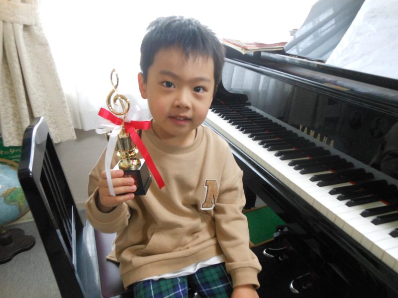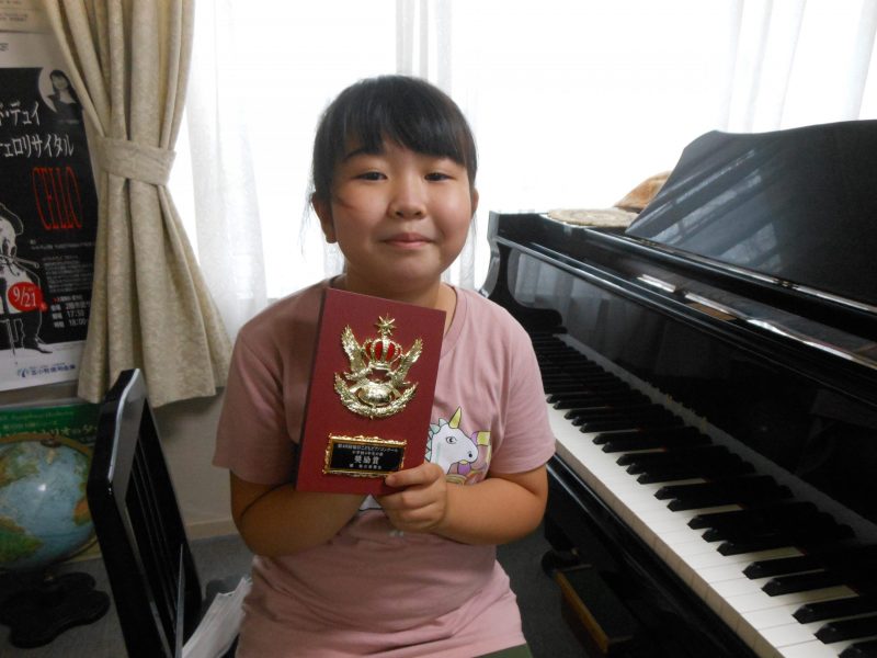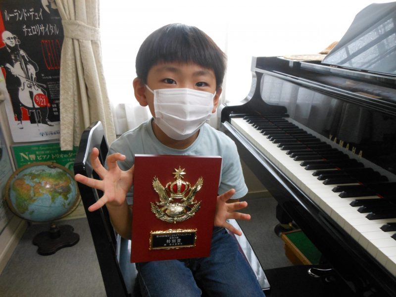 ♪「毎日こどもピアノコンクール」 5名参加で全員入賞。本選大会へ。 <入賞の盾と一緒に>