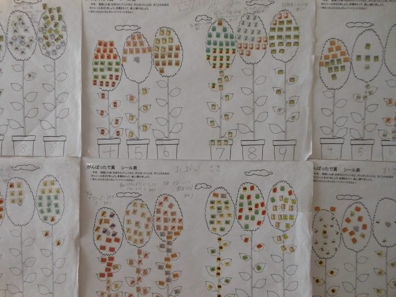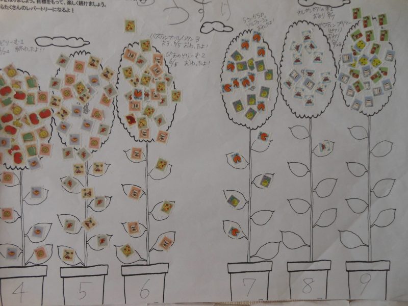 譜読み、楽典テキスト、宿題プリント、音当て、聴音、ピアノ曲の合格など頑張った分、 シールをもらって月ごとのお花をシールで沢山貼りました。