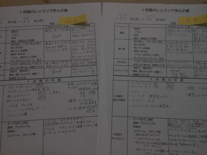 ♪ 「1年間のまとめ」 一人一人の教本の進度や基礎知識、テクニックや手指の形、音の聴き取り、各行事 やコンクール参加曲などをまとめて保護者の皆様にお渡ししました。
