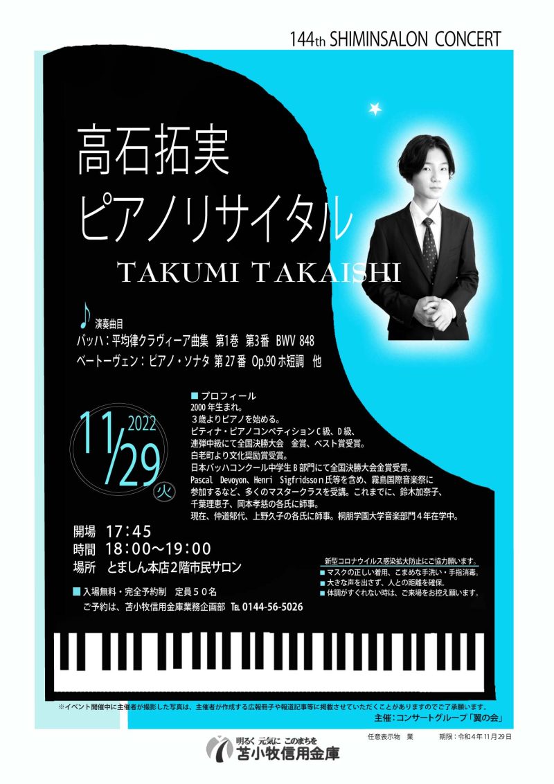 ピアノ門下卒業生(桐朋学園大学音楽学部4年生)の高石拓実君のリサイタルを市内の信用金庫の苫信サロンで開催致しました。(門下生ОBでの”コンサートグループ「翼の会」“での主催。)