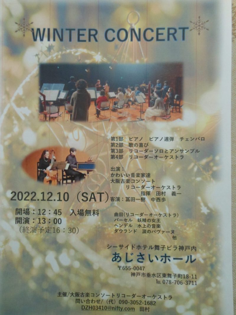 3年前からリコーダーの恩師田村義一先生の「大阪古楽コンソート・リコーダーオーケストラ」に参加して、この演奏会のために関西まで練習や合宿に参加していました。