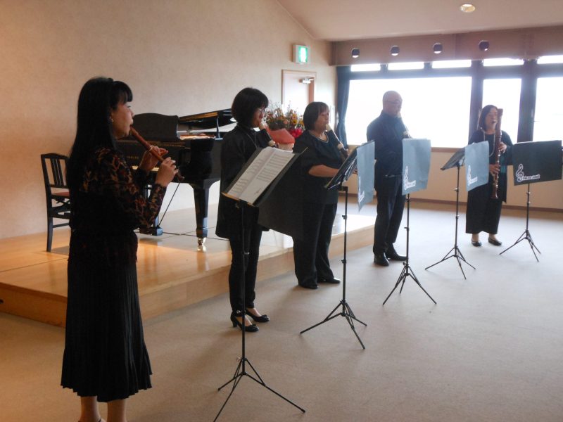 秋晴れの日に市内の老舗お菓子店のホールで大人の門下生3名とリコーダーアンサンブル「モナミ」のメンバーが