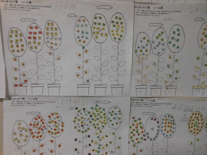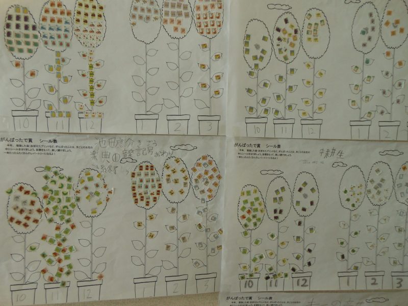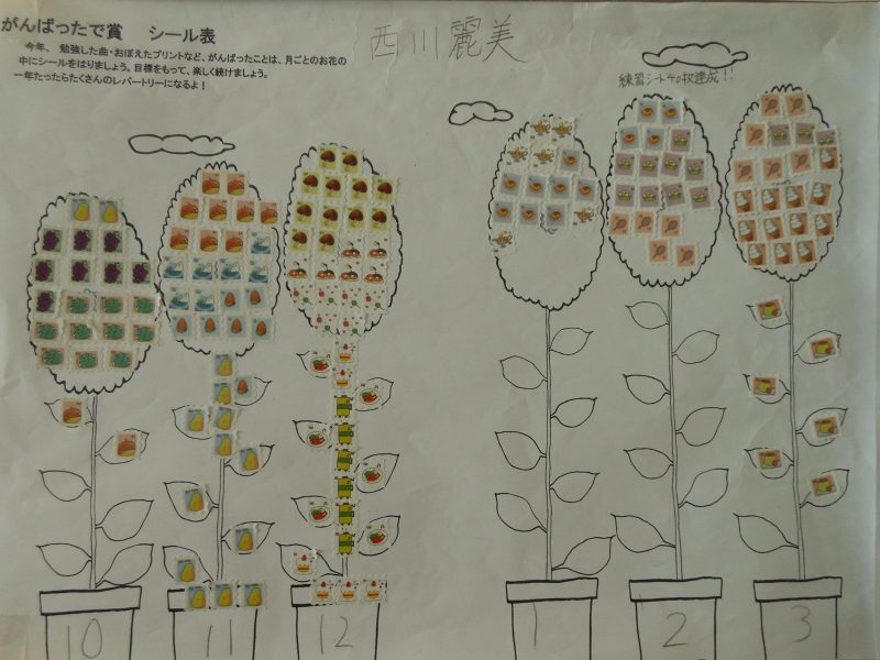ひと月ごとのお花のイラストにシールを貼って頑張りました。