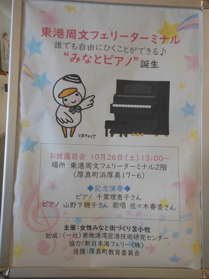 苫小牧東港フェリーターミナル(厚真町)に「みなとピアノ」が設置され、オープニング記念で20分演奏
