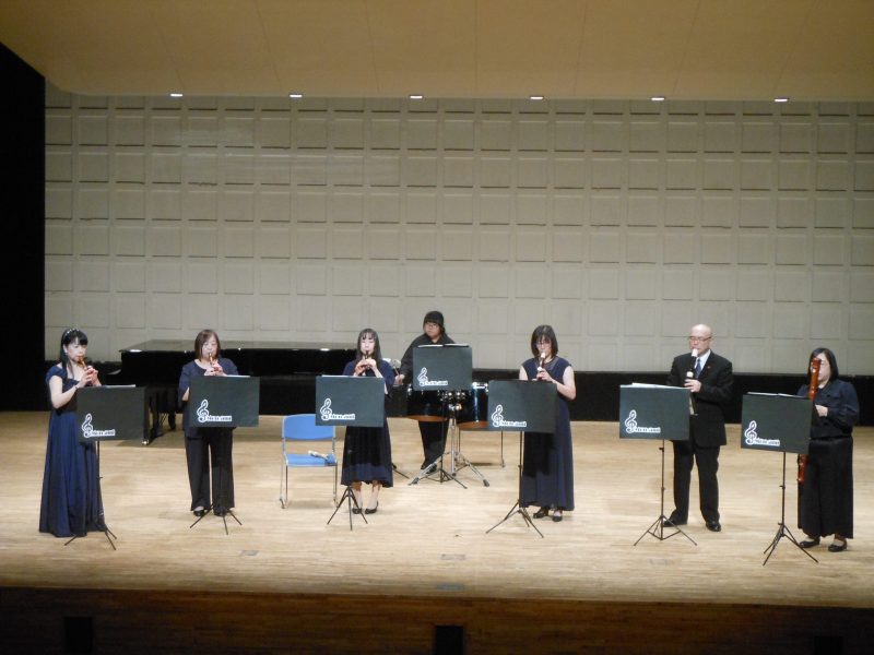 リコーダーの恩師 田村義一先生を神戸からお招きしてバロック音楽のソロ曲、2重奏曲を演奏しました。又、20年以上指導に携わっている市内のリコーダーサークルやアンサンブルの皆様と7重奏曲や合奏も演奏致しました。他に歌や打楽器も加わり満席の100名を超すお客様にご披露致しました。
