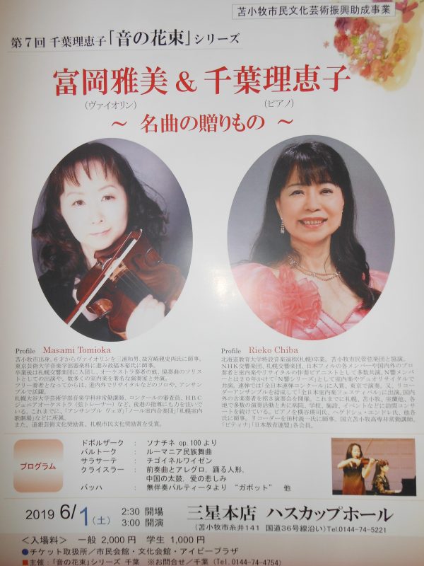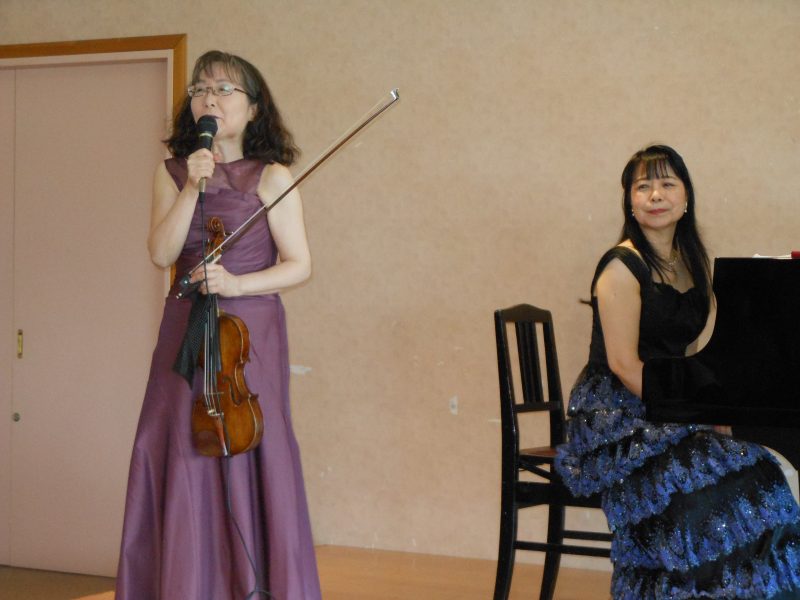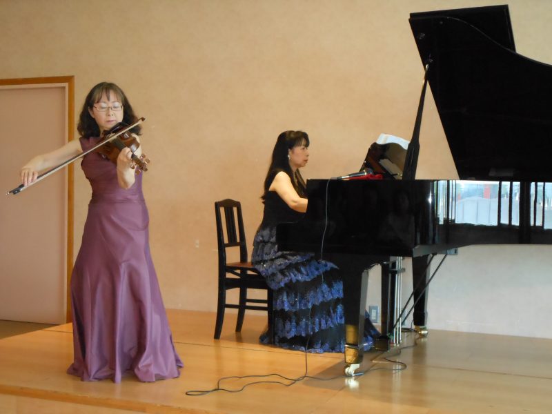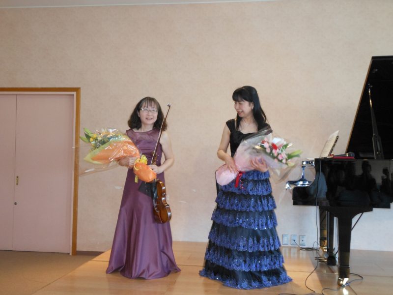 当日は穏やかな天気で爽やかな1日となりました。会場には札幌や室蘭からのお客様も含め100名近くとなり用意した客席がびっしりになりました。ドボルザークの「ソナチネ」で開演して、ゲストのヴァイオリニストの方が曲の紹介をし乍ら和やかに進みました。最後のサラサーテ「チゴイネルワイゼン」を演奏し終わると「ブラボー」の掛け声があちこちからかかってきて感激致しました。終了後は「ヴァイオリンとピアノのバランスがとても良かった」「久しぶりに良い音楽が聴けました」等、嬉しい感想を沢山頂きました。