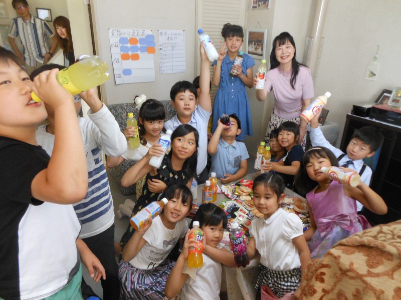 - 持ち寄りのお菓子とジュースでかんぱーい
