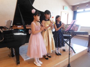 | 11.Hちゃん(中3) | 高校受験を控えお勉強も大変でしたが、早めに準備して発表会に臨みます。 リコーダーもメキメキ上達して、外部の演奏会で演奏するまでになりました。 大人しい性格ですが、内には燃えるものを秘めているんですね。 |